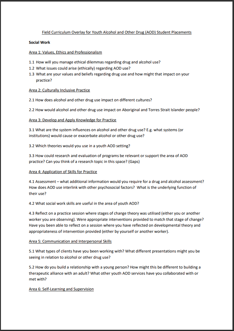 The field curriculum overlay is a document specific to students studying a Bachelor of Social work. The overlay was designed to contextualise some of the standardised placement requirements.